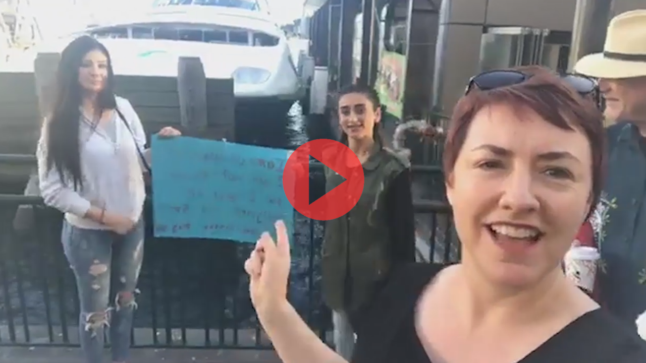 I rushed down to meet her, but by the time I’d arrived, her blindfold was off and she was taking her sign down. She didn’t mind that I asked her what had inspired her to spend the afternoon there, with a sign (see video) declaring who she was and an invitation to hug her. As I approached her, 2 men also came over, enthusiastically introducing themselves as ones who’d seen her earlier and hugged her when she was blindfolded. They had to get to a Ferry in 4 minutes, so I quickly started a facebook live video (gaining everyone’s permission of course). I love that they thought it was “lovely, a good cause, a bit of connectedness”.